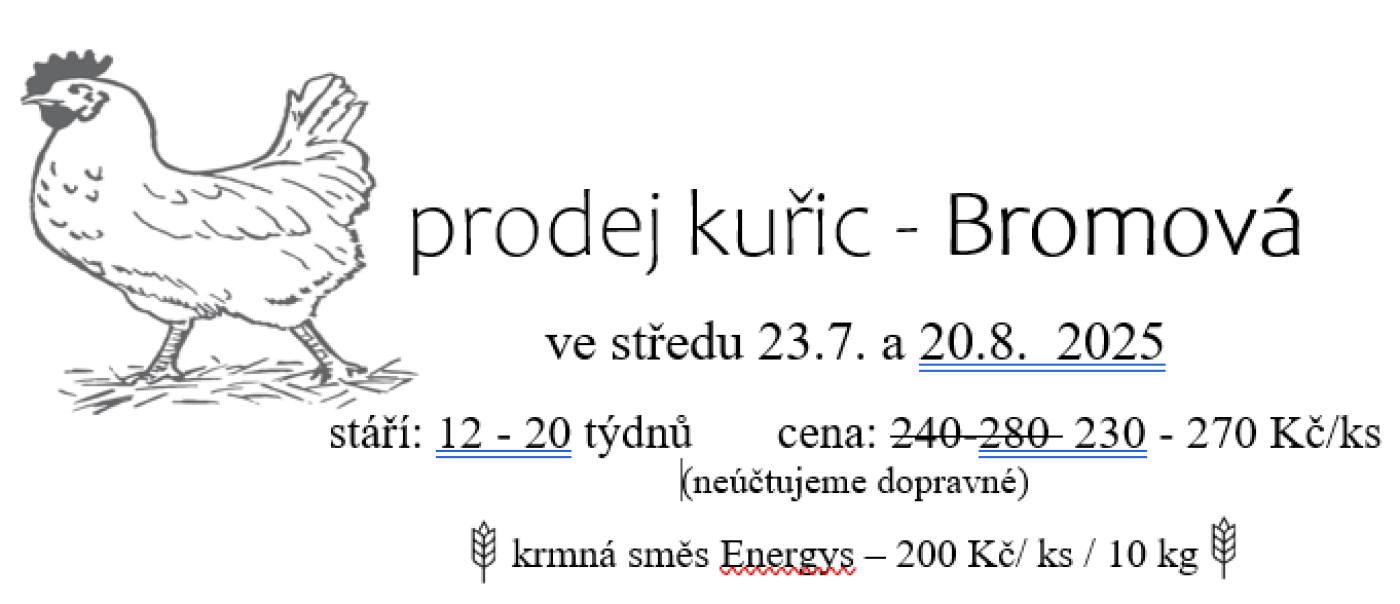 Paní Bromová bude prodávat slepice různých barev, cena od 230 Kč/kus dle stáří kuřic. Prodej se uskuteční ve dnech 23.7. a 20.8. 2025 v Horce II pod obecním úřadem ve 12:25 hod.